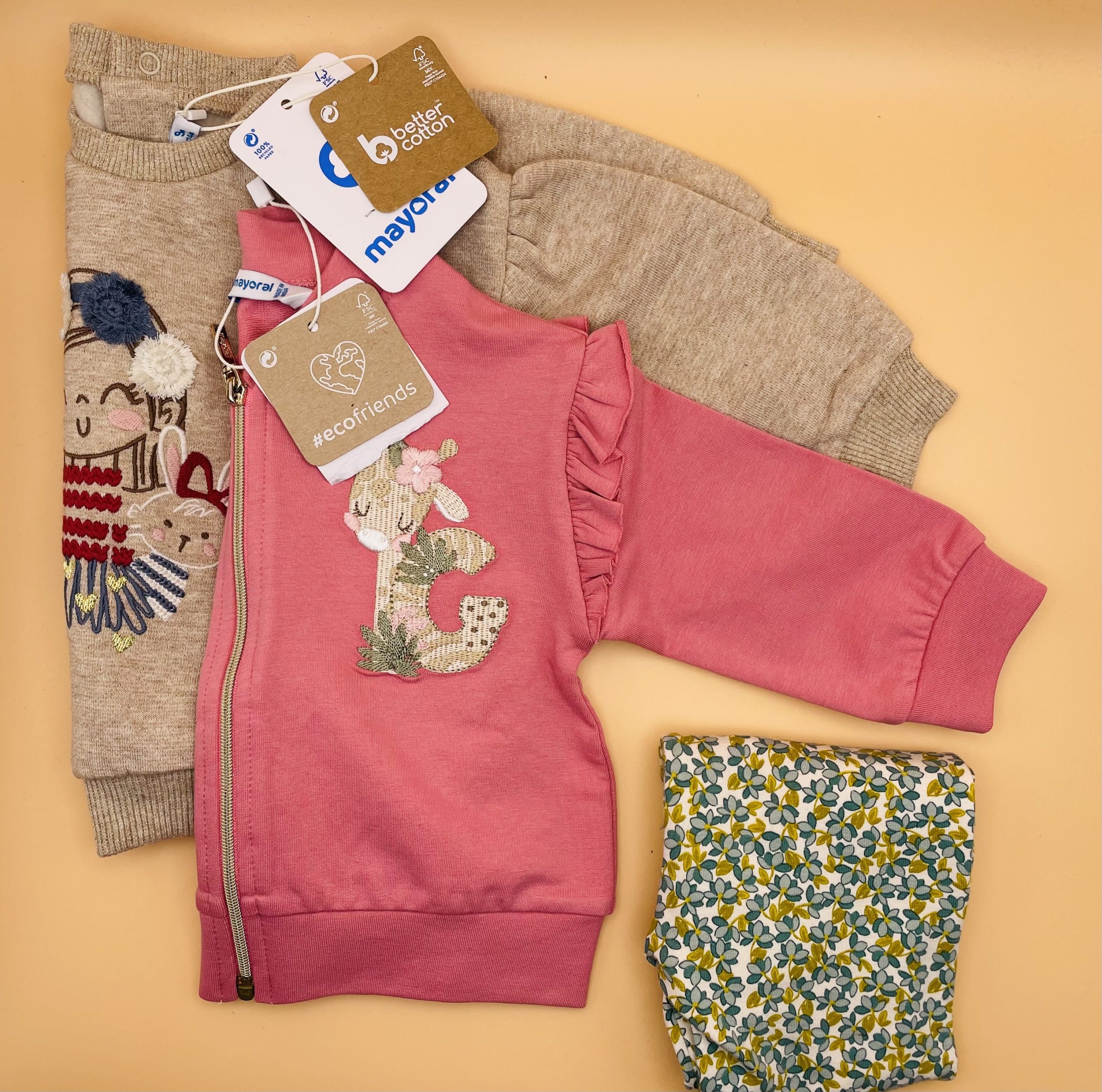 Mayoral offers baby clothing made from recycled materials through their ecofriends line. This collection focuses on sustainability by utilizing organic, sustainable, natural, and recycled fabrics. The baby tops shown in the picture above are from the ecofriends and better cotton lines.